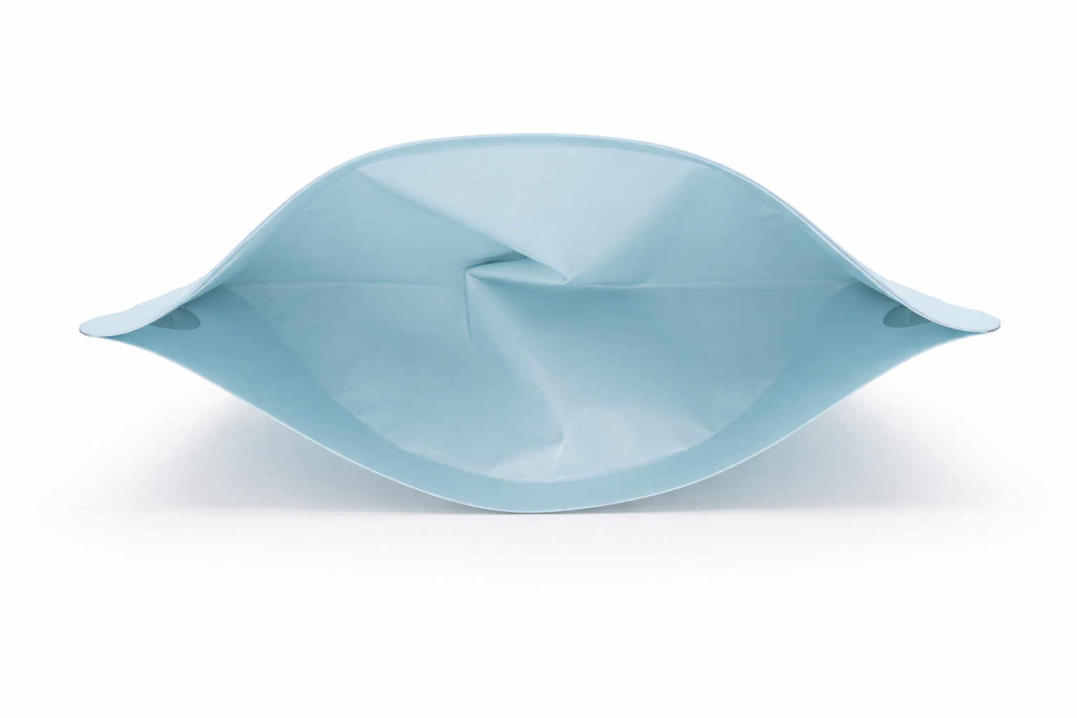 Su acabado mate en tono celeste aporta un aspecto moderno y diferenciador, ideal para marcas que buscan destacar en el lineal sin renunciar a la funcionalidad. La base permite que la bolsa se mantenga estable en posición vertical, facilitando su exposición y manipulación.